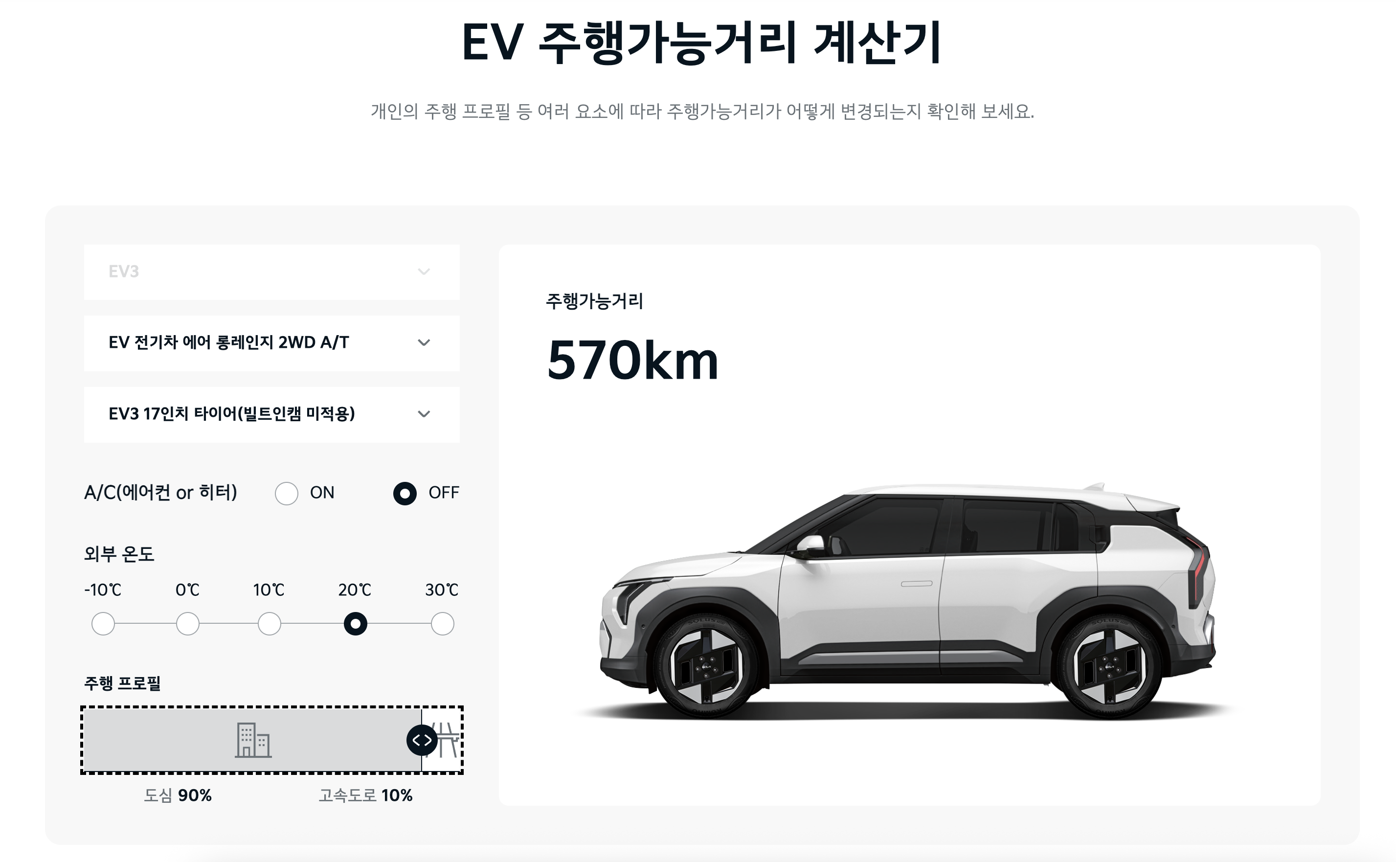 ev3 공식홈페이지 내 주행가능거리 계산기. 570km 주행 가능 세팅