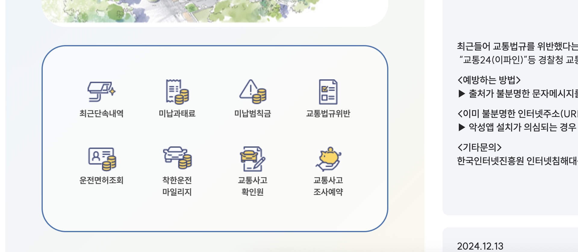 해당 사이트에서 차량번호 또는 운전면허번호를 입력하면 현재 미납된 과태료, 범칙금 현황을 확인할 수 있으며, 온라인으로 바로 납부도 가능합니다.