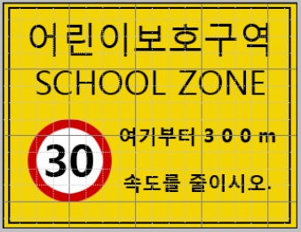 어린이보호구역은 노란색 바탕에 굵은 검정 테두리로 표시되어 있으며, 곳곳에 과속단속 카메라, 신호등, 경고 표지판 등이 설치되어 있습니다.