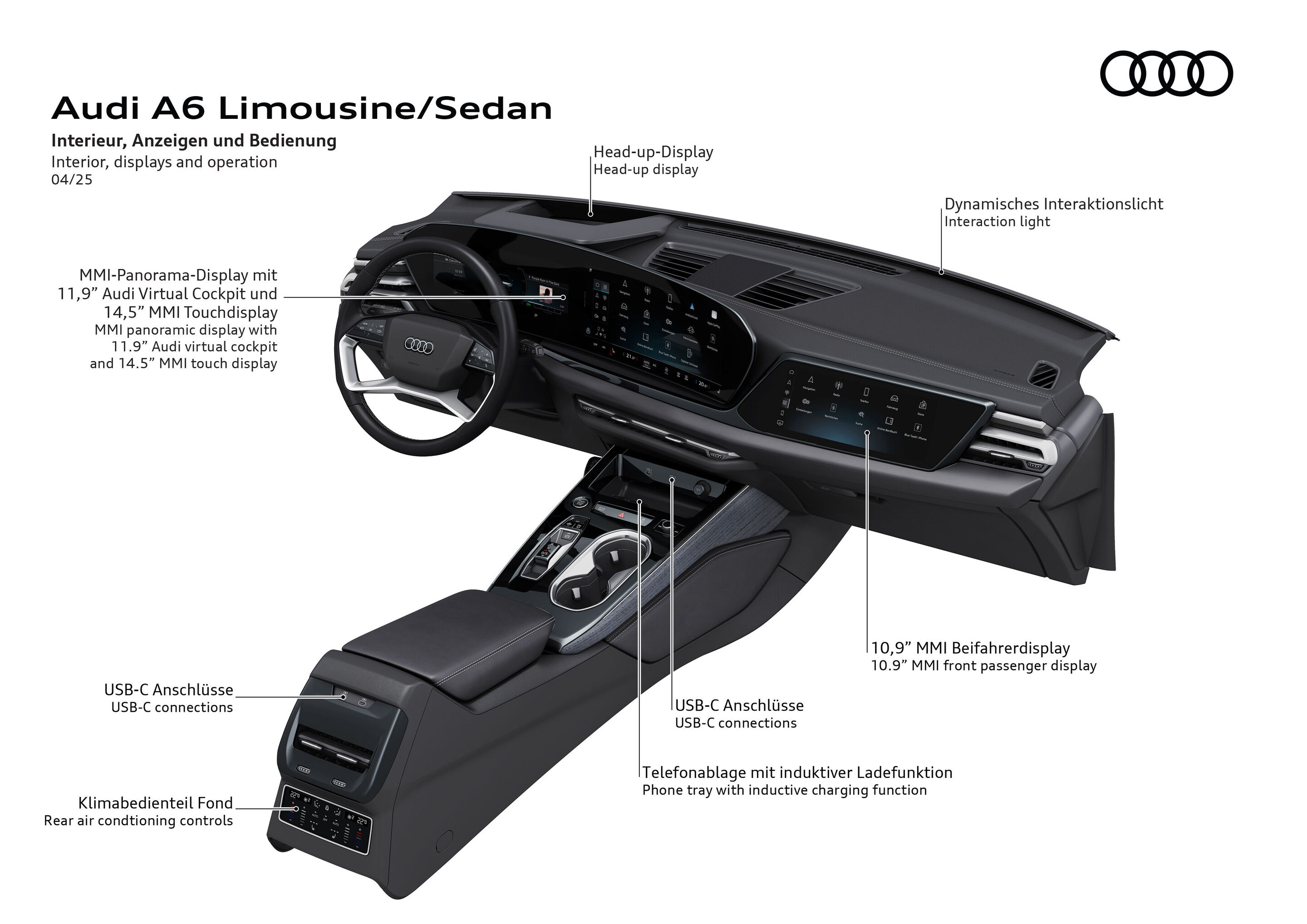 실내는 완전히 디지털화된 버추얼 콕핏 플러스(12.3인치)와 듀얼 센터 디스플레이(10.1인치 + 8.6인치)로 구성되어 있으며, MMI 터치 리스폰스 시스템이 탑재되어 물리 버튼을 최소화했습니다. 2025년형 A6에는 차세대 음성인식 시스템, OTA 소프트웨어 업데이트, 그리고 고속도로 보조 운전 시스템이 기본 탑재되어 사용자 편의성을 높였습니다.