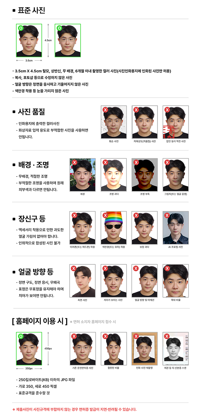 - 사진의 해상도, 배경, 규격 등이 부적합하면 신청이 반려될 수 있습니다.