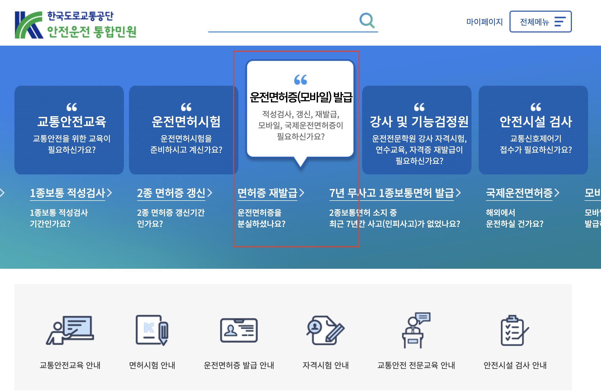 - '운전면허' 메뉴 → '면허증 갱신/재발급' 선택