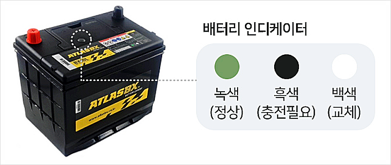 배터리 상태는 차량 보닛을 열고 배터리 상단의 인디케이터를 통해 확인할 수 있습니다.