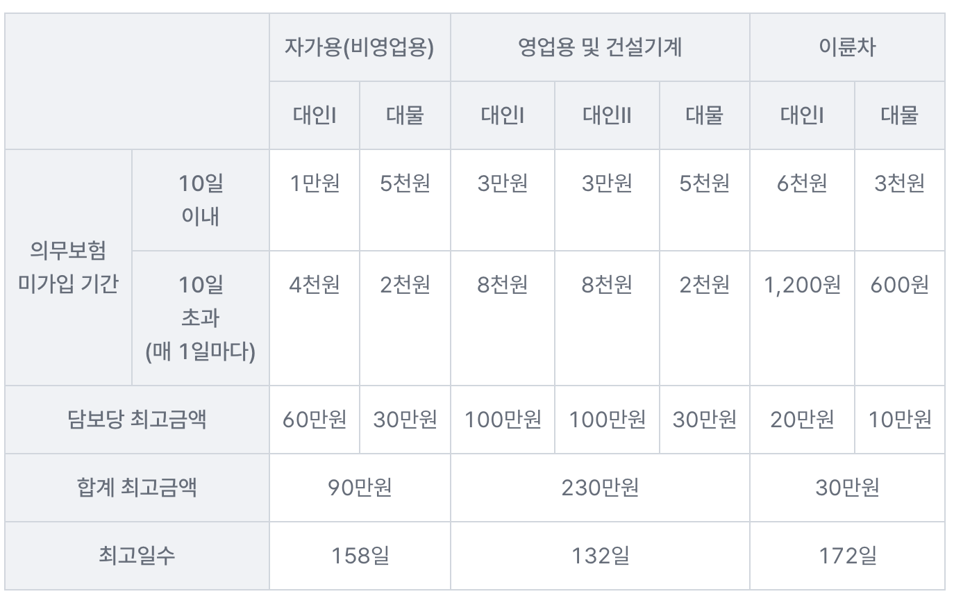 - 자기차량손해: 내 차가 사고로 파손되었을 때 수리비를 보상받는 항목입니다. 자차 미가입 시 수리비를 전액 부담해야 합니다.