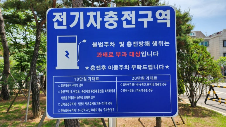 환경친화적 자동차의 개발 및 보급 촉진에 관한 법률(친환경차법)에 따르면, 충전 구역 내에 비전기차 또는 충전하지 않는 전기차가 일정 시간 이상 주차할 경우 과태료 부과 대상이 됩니다.