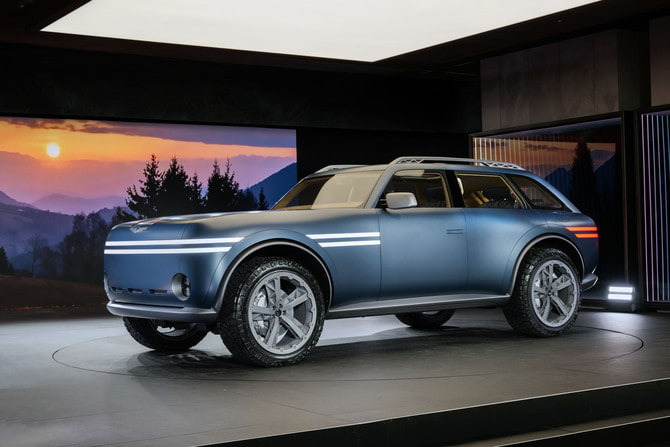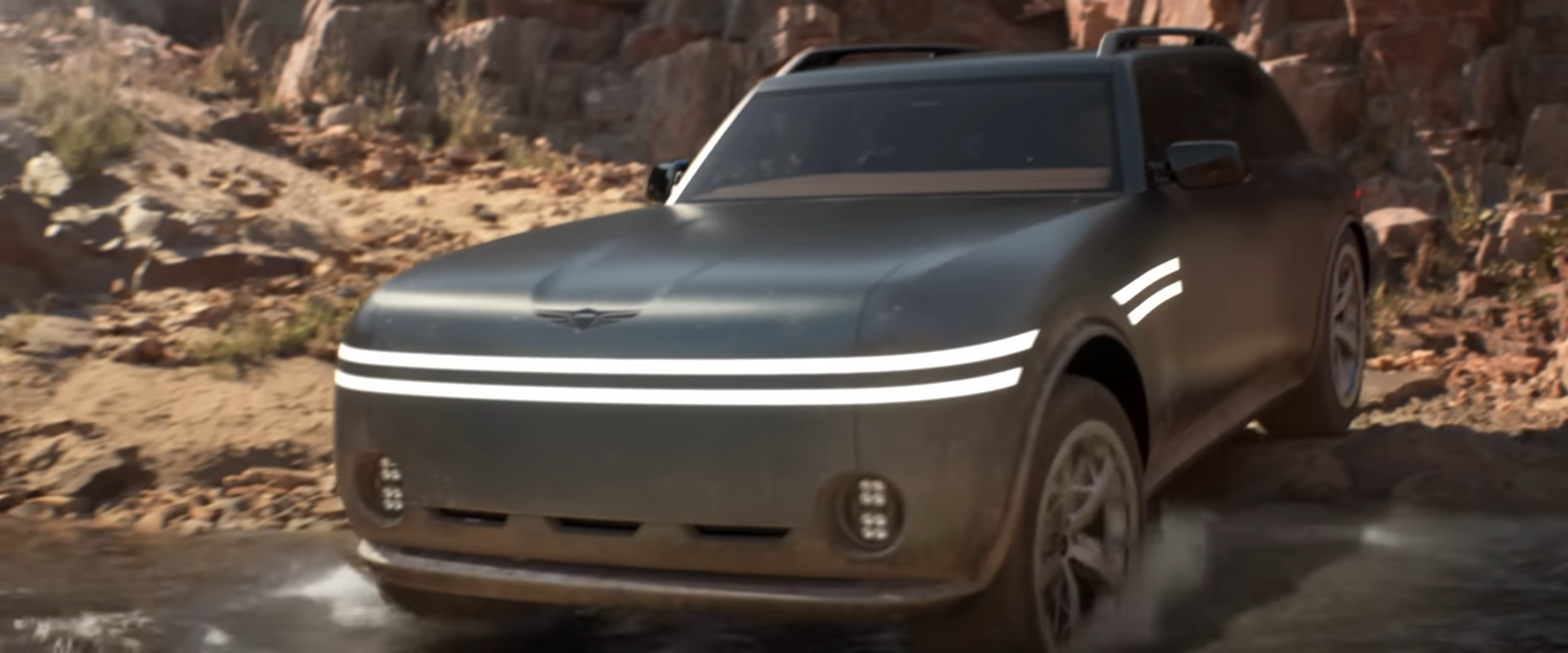 외관은 긴 후드, 각진 캐빈 라인, 가파른 C-필러 등 기존 제네시스 SUV와 다른 실루엣을 선보이며, 위아래로 열리는 분할형 테일게이트, 루프랙, 비드락 휠, 휠 클래딩 등 험로 주행을 위한 실용적 디테일도 눈에 띕니다.
