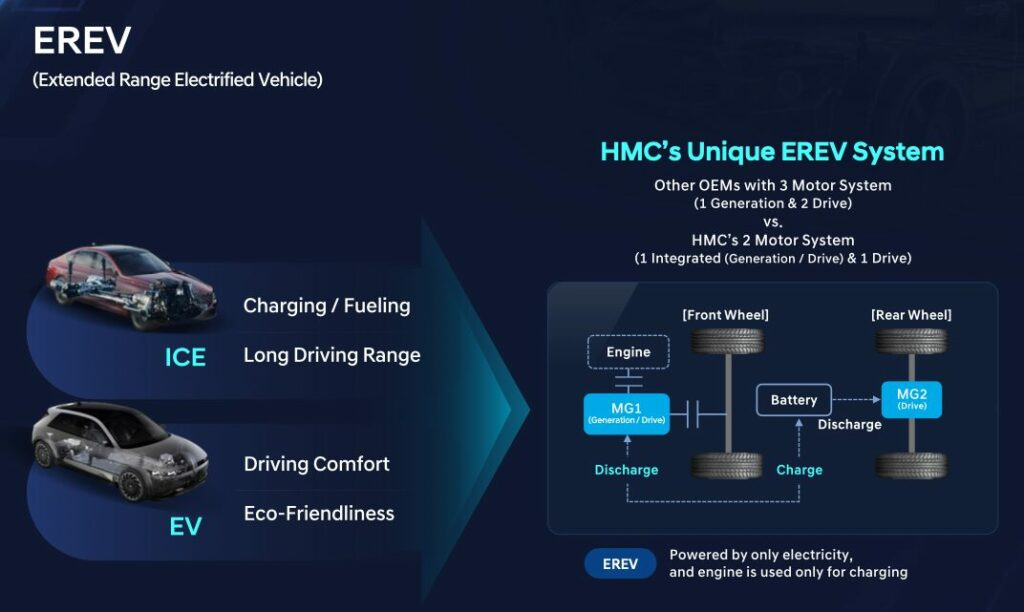 EREV는 연장형 전기차로, 주행은 전기로 하되 배터리 잔량이 부족할 경우 작은 내연기관이 발전기 역할을 해 전력을 공급하는 방식입니다. 순수 전기차처럼 주행할 수 있으면서도 긴 거리에서는 주행 거리 불안(레인지 불안) 없이 운전할 수 있는 점이 특징입니다.