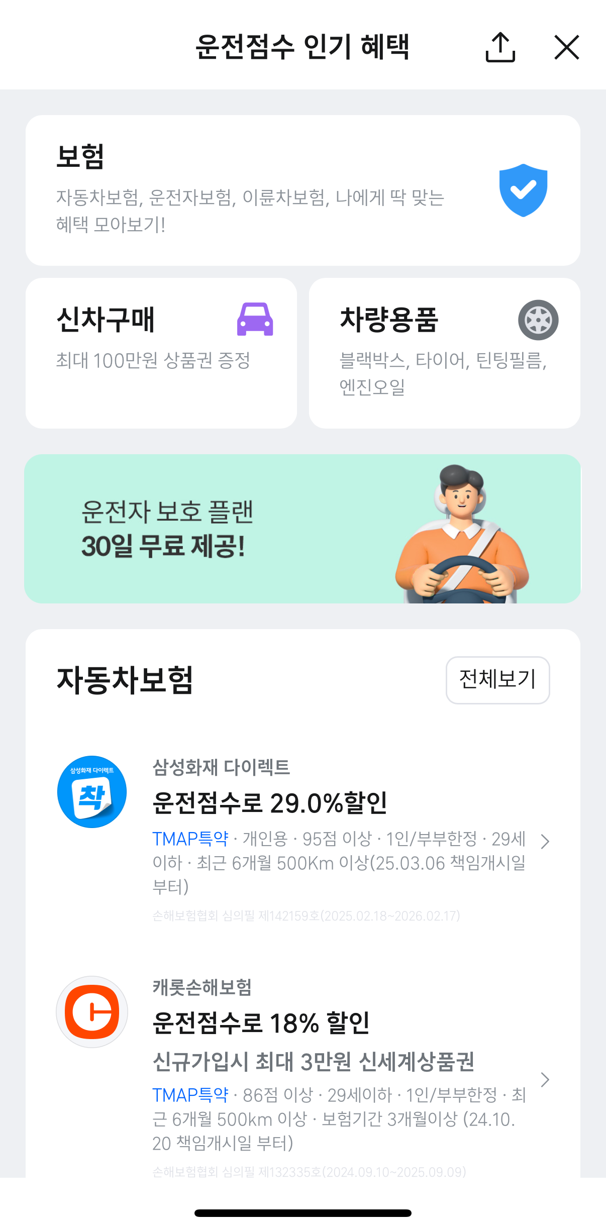 ✔️ T맵 안전운전 점수 76점 이상 (보험사별로 70점 이상, 일부는 1000km 이상도 인정)