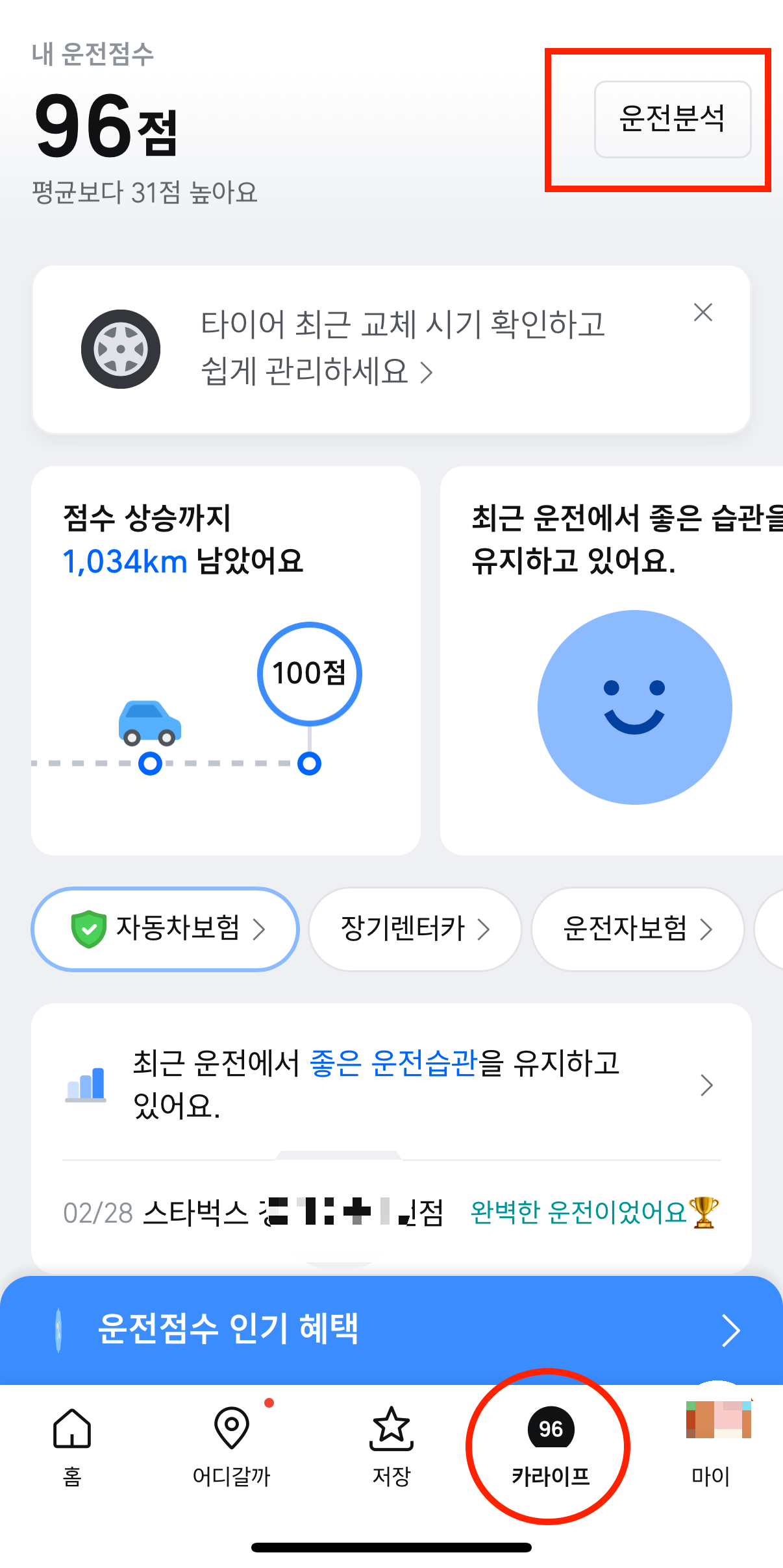 - ‘운전습관’ 또는 ‘안전운전 점수’ 항목 선택