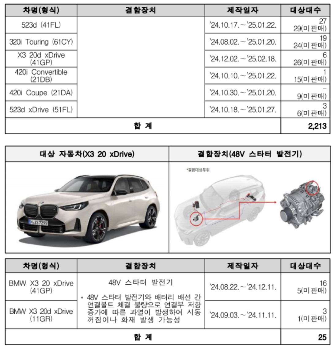 또한 X3 20 xDrive 등 2개 차종, 25대는 배터리 배선과 발전기 연결볼트의 체결 불량으로 유사한 문제가 발생할 수 있다는 점에서 리콜 조치가 이뤄지고 있습니다. 해당 리콜은 5월 16일부터 이미 시행 중입니다.