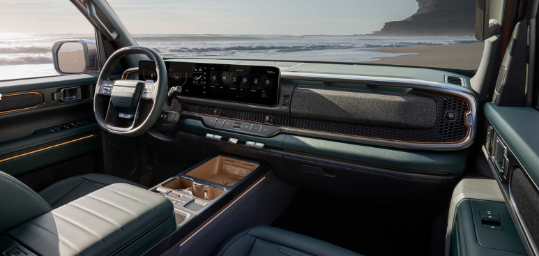 전면에는 블랙 무광 가니시와 전용 범퍼 하단 견인고리가 적용되어 터프한 인상을 줍니다. 실내는 딥그린과 테라코타 브라운의 전용 컬러로 마감되어 고급스러움과 아웃도어 감성을 동시에 갖췄습니다.