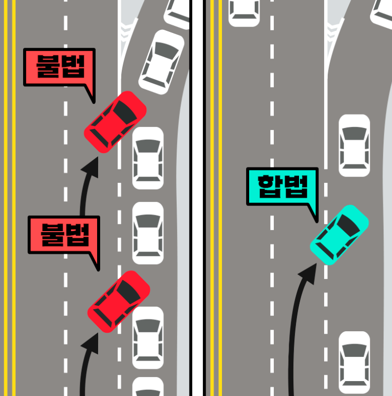 • 끼어들기 금지 위반정체 또는 서행 중인 차들 사이에 무리하게 비집고 들어가는 행위로, 도로교통법 제22조 및 제23조에 따라 제한됩니다.